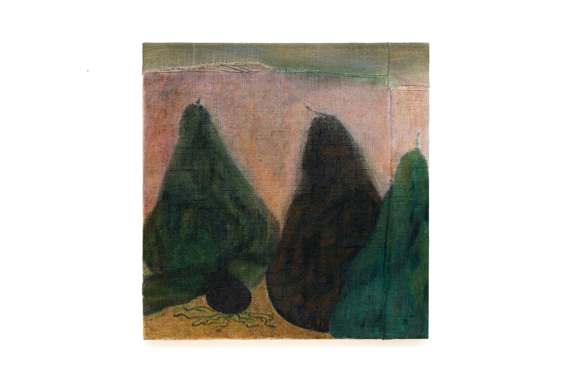 Zwiebel und Birnen (Dämmerung) acrylic and oil on burlap, 51 x 53 cm, 2025