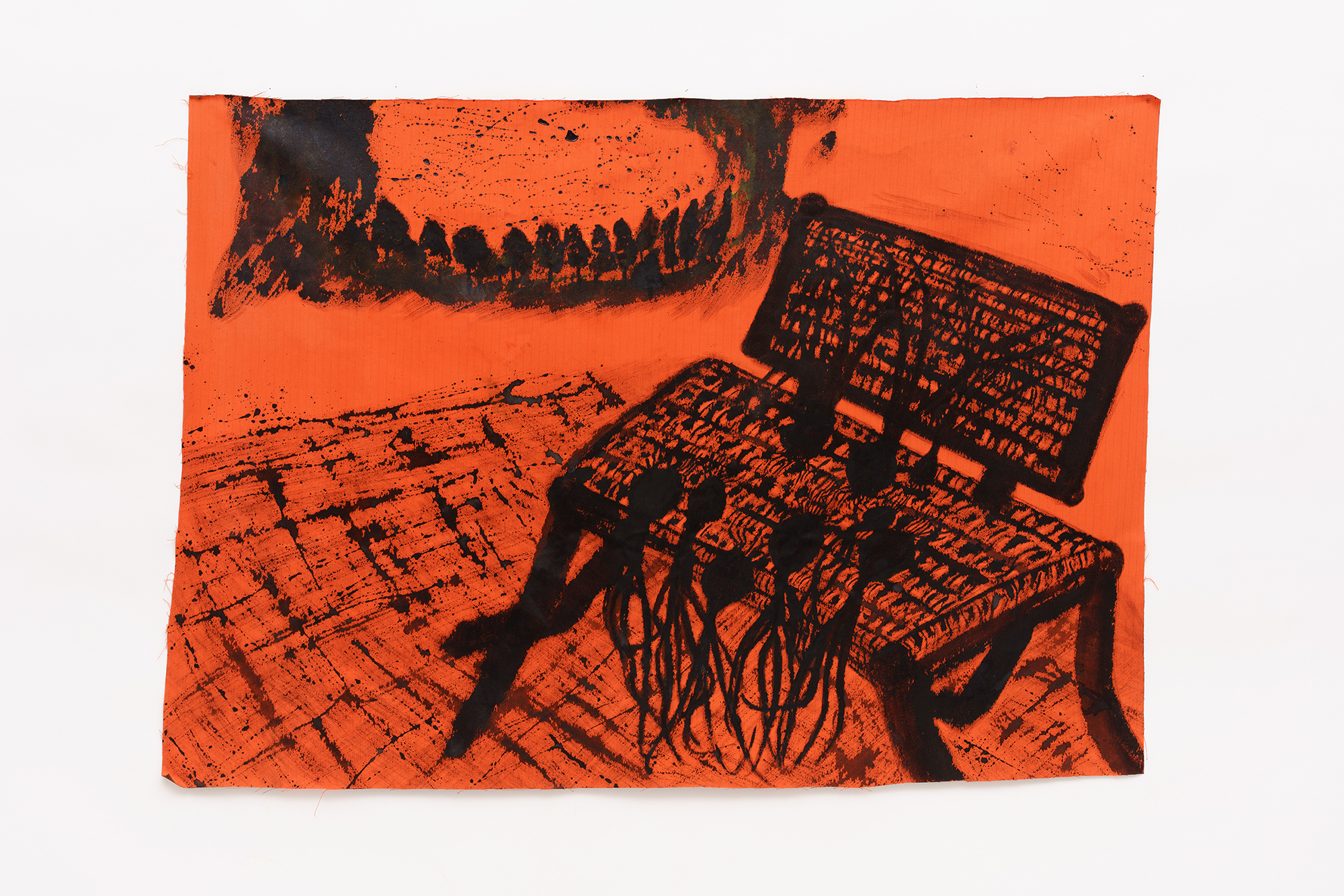 Albtraum mit Flechtbank (1) acrylic on paper, 72 x 74 cm, 2023